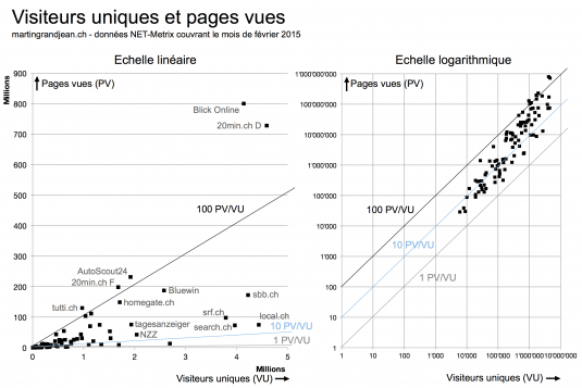 On observe, en particulier sur le graphique de droite dont l’échelle logarithmique permet de s’affranchir visuellement du très grand écart qui existe entre les échappés que sont Blick et 20Minutes et le peloton, que le nombre de pages vues par visiteurs uniques augmente plus vite que l’augmentation du nombre de visiteurs. En résumé, alors que pour les sites fréquentés par moins de 100’000 visiteurs uniques par mois ces derniers consultent entre 4 et 20 pages, cette fourchette est plutôt de 8 à 120 pages sur les sites fréquentés par 100’000 à 5 millions de visiteurs uniques par mois. Les “gros” sites ne sont donc pas uniquement importants en terme de public mensuel, mais également en terme de fréquentation régulière.