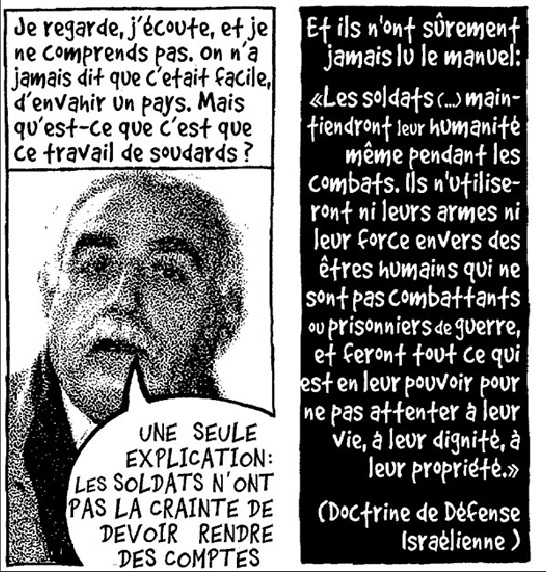 Le processus auteur-narrateur constitue une richesse pour le récit, car la mise en scène de son propre vécu ajoute de la crédibilité aux dessins racontant la « grande actualité » à travers la « petite histoire » des habitants d’un lieu. C’est flagrant dans le reportage BD faisant suite à un voyage du journaliste-dessinateur à Gaza en janvier 20096, dans lequel le conflit israélo-palestinien est raconté via les expériences (traumatisantes) de Sabah Abou Halima, Safoua Abou Namous ou encore Almaza Samouni, trois Gazaouies ordinaires dont les noms sont totalement inconnus de la communauté internationale. Glaçant.