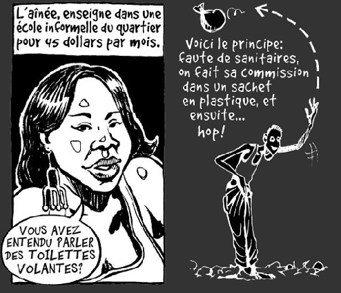 Le récit se construit à l’aide d’une scénographie, basée sur des plans-séquences. Le journaliste-dessinateur se sert donc du storytelling pour raconter des faits… autrement ! Par exemple, le recours à l’anecdote est fréquent dans ses BD-reportages, celle-ci permettant d’ « adoucir » les passages plus durs et d’accorder une pause au lecteur. Cependant, bien qu’une anecdote puisse paraître un détail, elle donne en réalité la possibilité d’en savoir plus. C’est notamment le cas des « toilettes volantes » dans les bidonvilles de Nairobi3. À première vue humoristique, cette case est en fait lourde de sens : elle permet d’évoquer la réalité du lieu observé par le reporter BD et la misère qui l’encercle. L’humour constitue également une technique narrative. Chappatte l’utilise pour faire baisser la pression du récit, rapprocher les lecteurs et alléger une scène emplie de tristesse. Mais gare à se méprendre : certaines cases sont certes supposées faire rire, mais doivent tout autant provoquer la réflexion chez le lecteur.