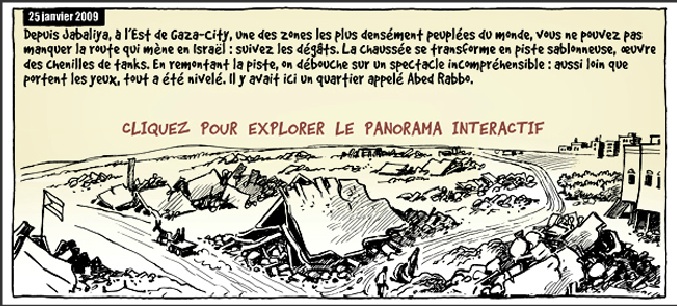 Dessin panoramique du quartier d’Abed Rabbo devasté par Tsahal, « Dans l’enclos de Gaza ». En cliquant sur ce lien, vous pourrez découvrir la version interactive de cette case : http://www.bdreportage.com/dans-lenclos-de-gaza/ Mise en ligne par Le Temps.ch. Parution dans le quotidien Le Temps le 5.2.2009. Parution dans le International Herald Tribune le 9.2.2009 © Chappatte