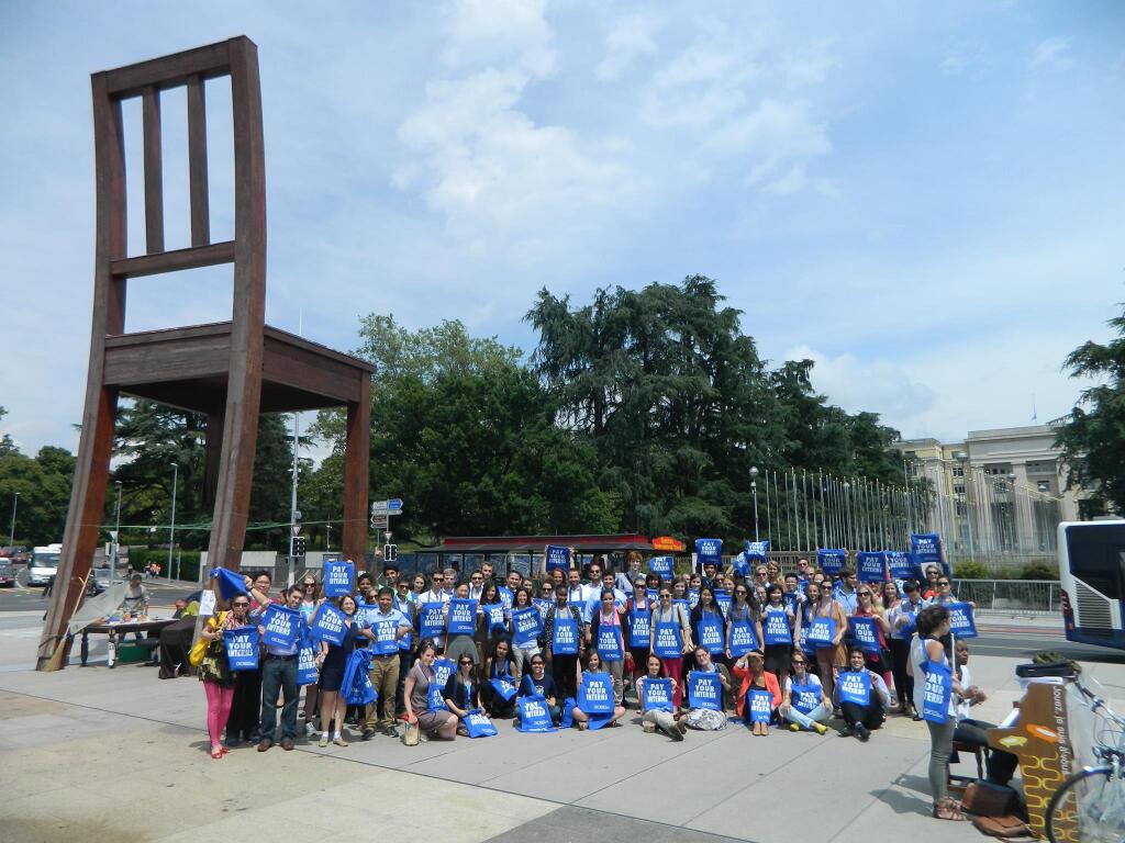 Jeudi dernier 20 juin 2013, la campagne « Payez vos stagiaires »2, lancée par « l’Association des stagiaires de Genève (GIA) »3, a mobilisé près de 100 partisans sur la fameuse place de la « Chaise cassée » en face du Palais des Nations. Coordonné par la « Coalition internationale pour des stages équitables »4, le mouvement a lieu à Genève, mais aussi à New York et Londres. Il s’agit des principales villes où la concentration des activités autour de la politique internationale permet de profiter du taux de chercheurs d’emploi largement plus élevé que les places à pourvoir. Mais « l’exploitation » des stagiaires est un fait qui s’étend à bien d’autres villes comme Vienne, La Haye ou Washington5.
