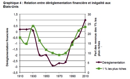 À qui la faute ? Oxfam répond à cette question sans ambigüité : la dérégulation des marchés financiers a un rapport direct avec les inégalités. Dès les années 1980, « les secteurs financier et bancaire ont dépensé des millions pour déréguler les marchés » qui avaient été assujettis après la grande dépression des années 1930. Or, l’augmentation des inégalités et la dérégulation sont liées, comme le montre le graphique suivant :
